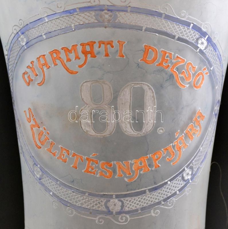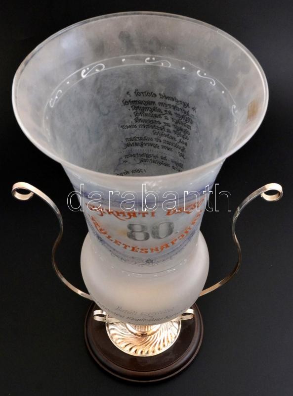 Gyarmati Dezső (1927-2013) olimpiai bajnok vízilabdázó 80. születésnapjára készített egyedi muránói serleg. Kézzel festett, Tóth Árpád verssel és aláírásokkal. 42 cm