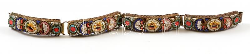 Leírás: cca 1910 Mozaik üvegberakásos karkötő, réz foglalatban, jelzés nélkül, sérült, h:14 cm