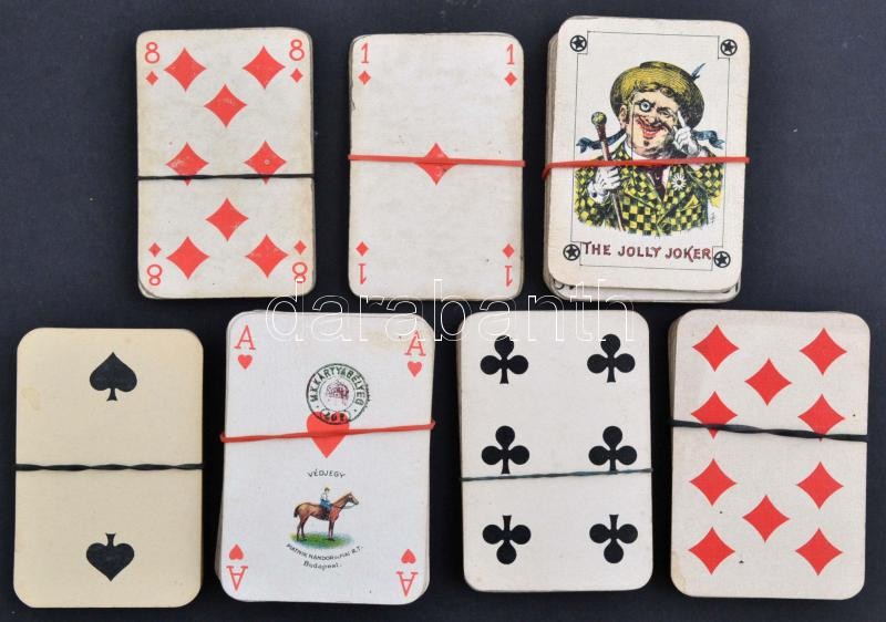 Leírás: Régi tarokk és francia kártyák vegyesen, hiányos paklik, közte kártyabélyeges is