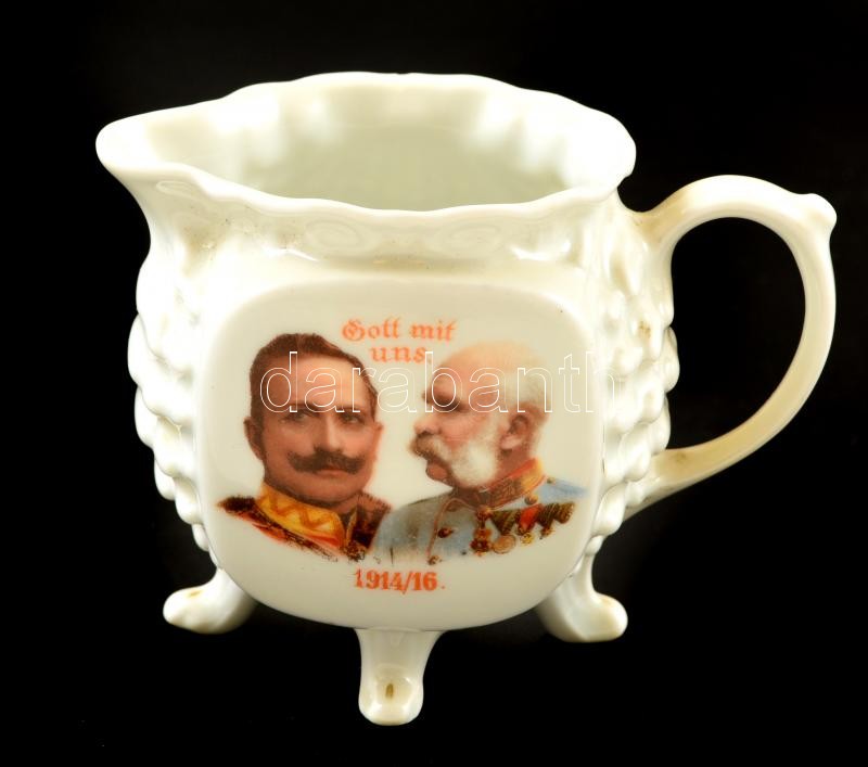 Leírás: 1916 Német első világháború korabeli porcelán kis kiöntő "Gott mit uns" feliratú matricás képpel, nagyon apró lepattanással, m:6,5