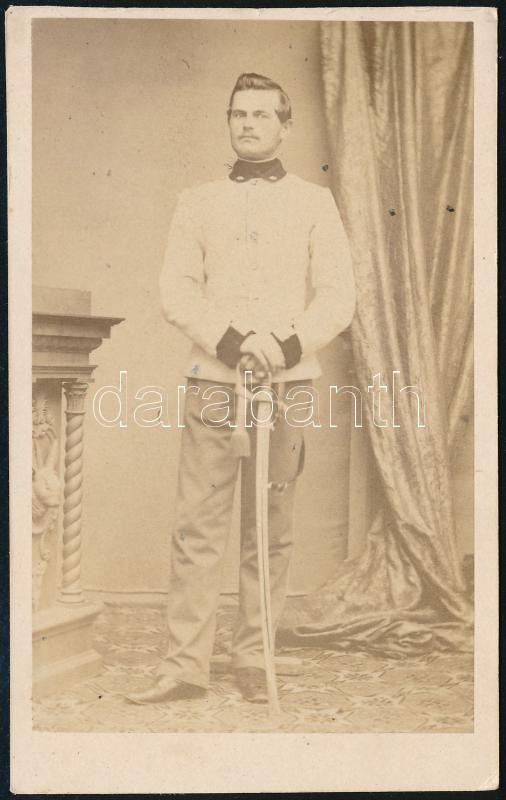 Leírás: cca 1864 Katona az egri helyőrségből, Mihály József egri fényképész műtermében készült, vizitkártya méretű fénykép, 10x6,3 cm