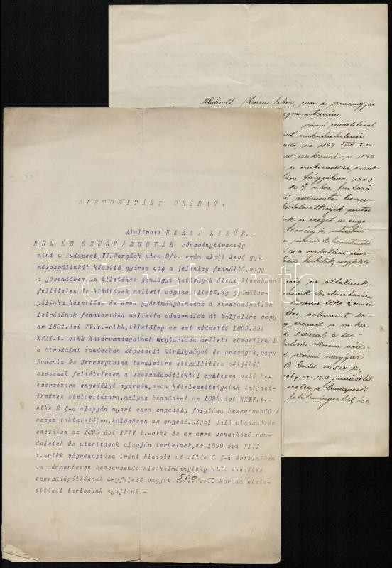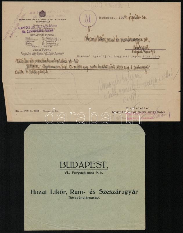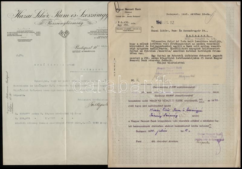 1911-1946 Hazai Likőr-, Rum és Szeszárugyár Rt. különféle iratai, és borítékja, közte a Magyar Nemzeti Bank letéti jegyével, valamint 1919-es hadikölcsön igazolással, a cég fejléces papírján, (rajta: 'Proletári üdvözlettel', 1919. május.16.) Változó állapotban.