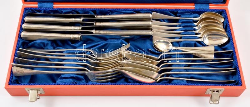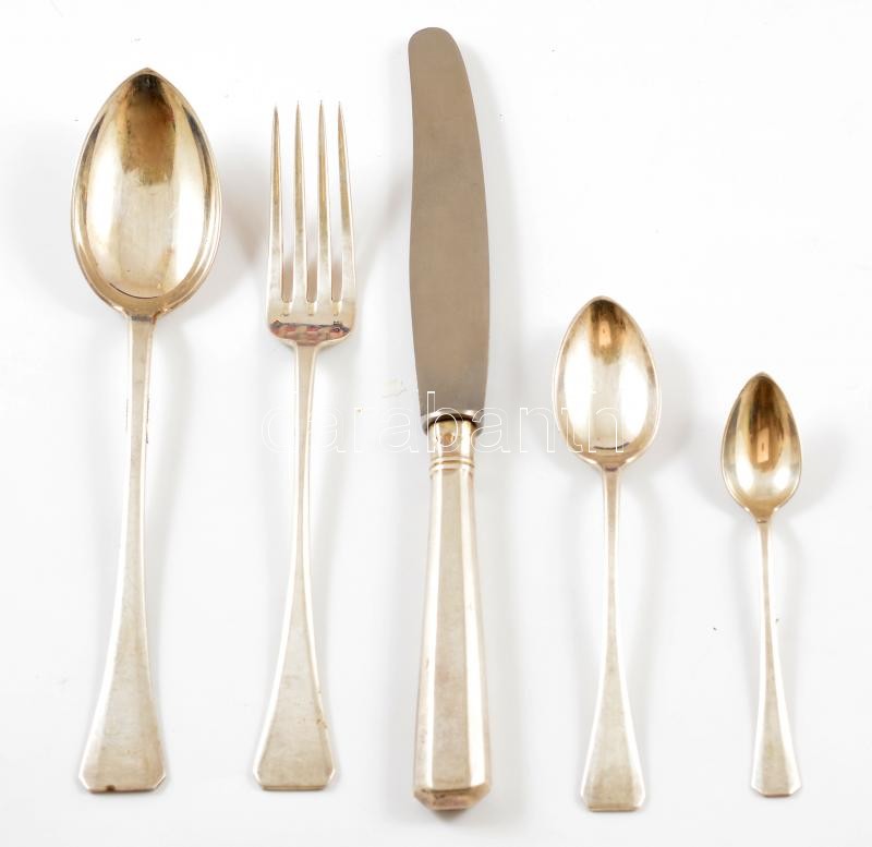 Leírás: Ezüst (Ag.) monogramos (FM) evőeszköz készlet (30 db), jelzett, eredeti foltos dobozában, nettó:1019 g+ bruttó: 455g