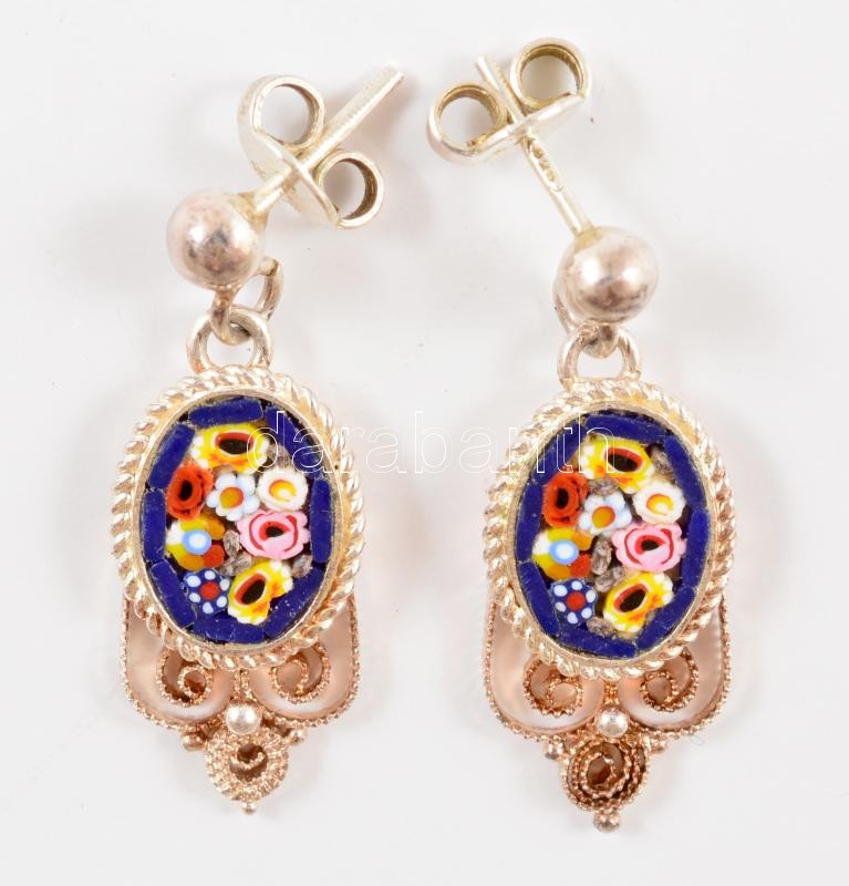 Leírás: Ezüst(Ag) millefiori díszítésű fülbevalópár, jelzett, h: 2,5 cm, bruttó: 3,8 g