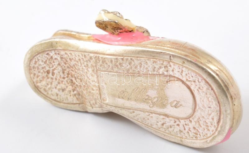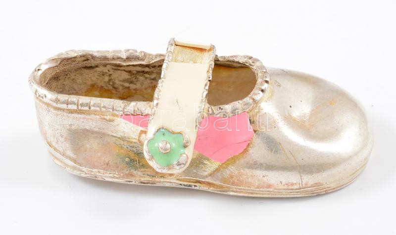 Leírás: Ezüst(Ag) miniatűr babacipő, jelzett, sérült zománc díszítéssel, h: 4,5 cm, bruttó: 18,2 g