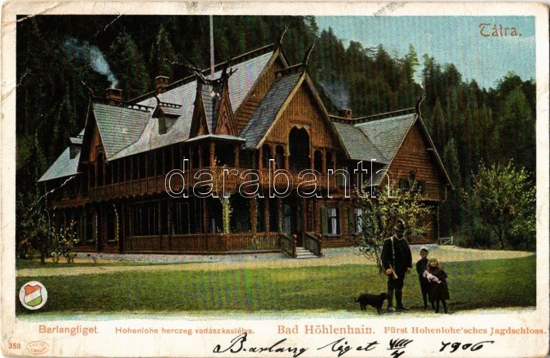 Leírás: 1906 Barlangliget, Höhlenhain, Tatranská Kotlina (Tátra, Magas Tátra, Vysoké Tatry); Hohenlohe herceg vadászkastélya / Fürst Hohenlohe'sches Jagdschloss / hunting lodge, hunting castle (EB)