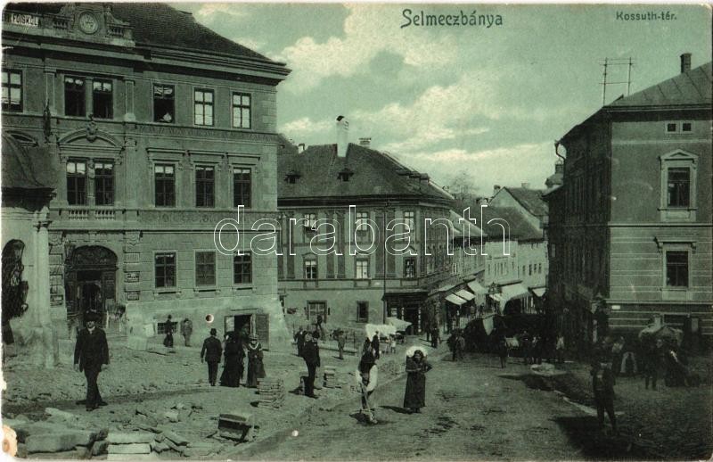 1911 Selmecbánya, Schemnitz, Banská Stiavnica; Kossuth tér, Bányászati és Erdészeti Főiskola központi épülete, piaci árusok, üzletek. Kiadja Joerges 1905. / square, mining and forestry academy's central building, market vendors, shops (lyuk / hole)