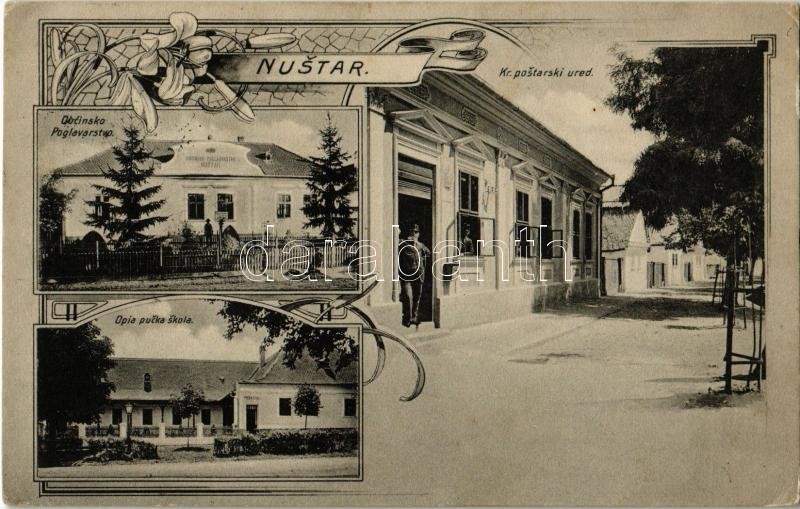 1911 Berzétemonostor, Nustar; posta hivatal, iskola, községháza / Kr. postarski ured, Obcinsko Poglavarstwo, Opia pucka skola / post office, school, town hall. Art Nouveau, floral (EK)