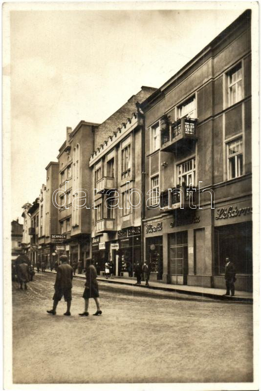 Leírás: Ungvár, Uzhorod; Utcarészlet, vendéglő, Schneck, Hecht üzletei / street, restaurant, shops