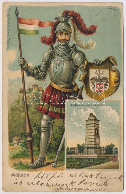 Leírás: 1904 Mohács, II. Lajos király szobra a Csele pataknál. Dombornyomott címeres és zászlós litho, kiadja Weiser Miksa (kicsit ázott / small wet damage)