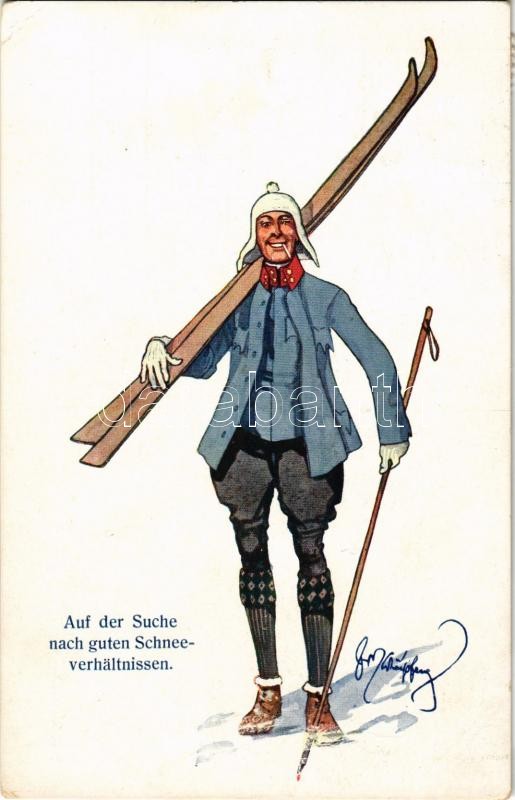 Leírás: Auf der Suche nach guten Schneeverhältnissen, Wintersport / skiing man, winter sport. B.K.W.I. 202-10. s: Fritz Schönpflug (EK)