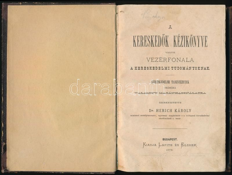 A kereskedők kézikönyve vagy vezérfonala a kereskedelmi tudományoknak. Kereskedelmi tanintézetek számára valamint magánhasználatra. Szerk.: Dr. Herich Károly. Bp.,1876, Lafite és Elsner, VII+199+XXII p. Korabeli félvászon-kötés, márványozott lapélekkel, kissé kopott borítóval, kissé sérült gerinccel, kissé foltos lapokkal.
