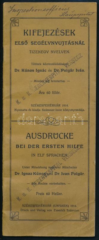 Dr. Kunos Ignác-Dr. Polgár Iván: Kifejezések első segélynyújtásnál tizenegy nyelven. Többek közreműködésével írta: - -. Székesfehérvár, 1914. Számmer Imre, 24 szt. lev. Kiadói papírkötésben, az alsó sarkán kis gyűrődéssel. 'K.u. K. Reservespital Versecz' pecséttel.