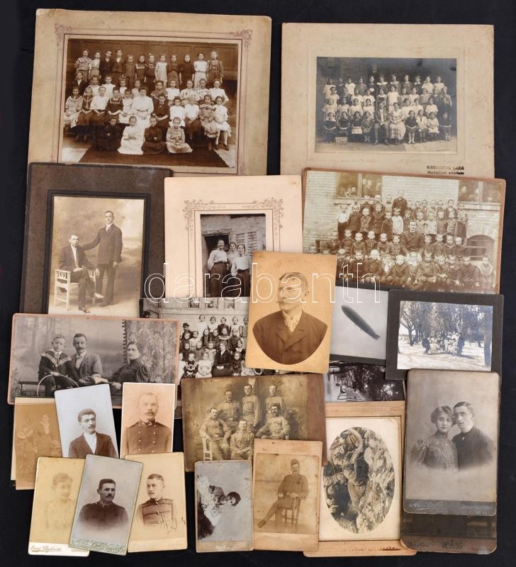 Leírás: cca 1880-1910 26 db klf méretű keményhátú fotó, benne katonaik is.