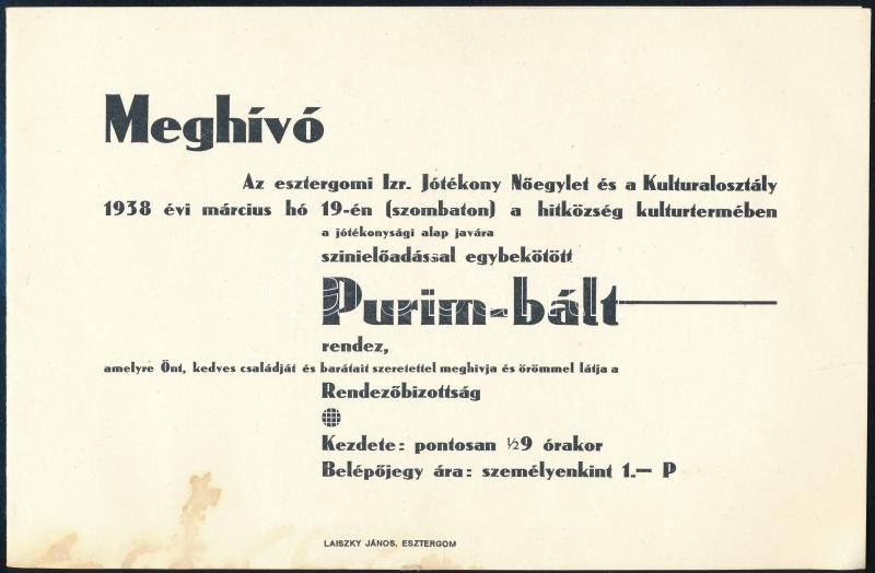 1938 Az esztergomi Izraelita Jótékony Nőegylet és Kulturalosztály puri... https://www.darabanth.com/hu/348-Gyorsarveres/348.0/Mutargy-papirregiseg-egyeb/Judaika~500024/1938-Az-esztergomi-Izraelita-Jotekony-Noegylet-es-Kulturalosztaly-purim-bali-meghivoja-ered~II1978847