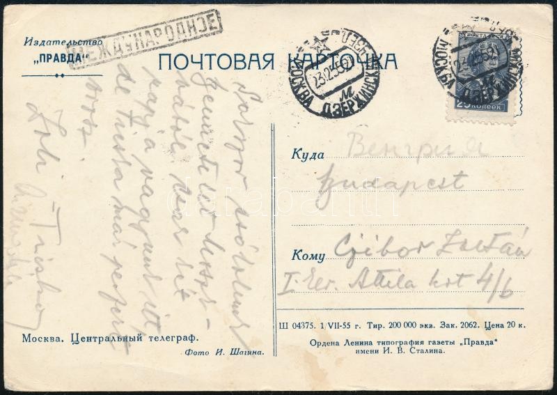 Leírás: 1955 Czibor Zoltán labdarúgó részére írt levelezőlap Moszkvából megküldve
