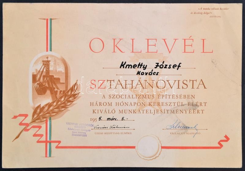 1955 Díszes sztahanovista oklevél kovács részére https://www.darabanth.com/hu/348-Gyorsarveres/348.0/Mutargy-papirregiseg-egyeb/Okmanyok~500017/1955-Diszes-sztahanovista-oklevel-kovacs-reszere~II1977770