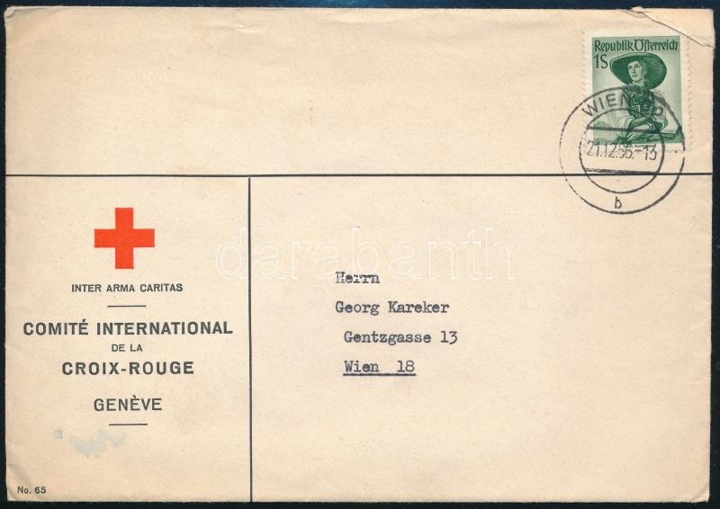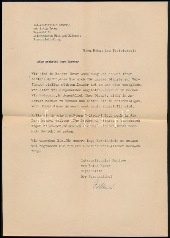 Leírás: 1956 a Nemzetközi Vöröskereszt magyarországi segélyszervezete vezetőjének gépelt, aláírt hivatalos levele bécsi delegált részére, borítékkal