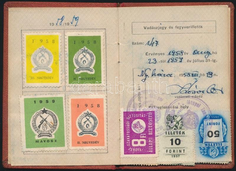 Leírás: 1958 a Magyar Vadászok Országos Szövetsége tagkönyve, 15 db bélyeggel