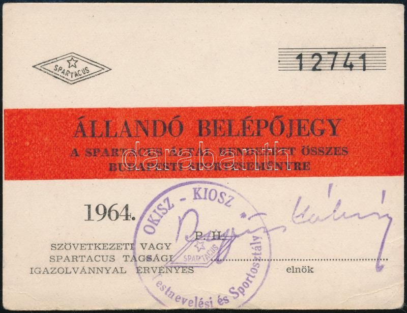 1964 Álandó belépőjegy a Spartacus összes budapesti sporteseményére https://www.darabanth.com/hu/348-Gyorsarveres/348.0/Mutargy-papirregiseg-egyeb/Okmanyok~500017/1964-Alando-belepojegy-a-Spartacus-osszes-budapesti-sportesemenyere~II1975654