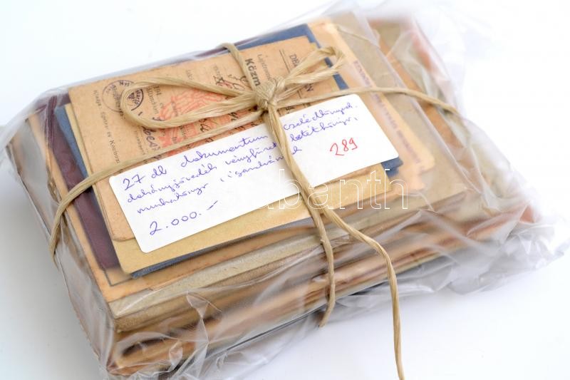 Leírás: Vegyes papírrégiség tétel: cselédkönyvek, dohányjövedék vényfüzet, betétkönyv, munkakönyv, igazolványok, stb., összesen 27 db