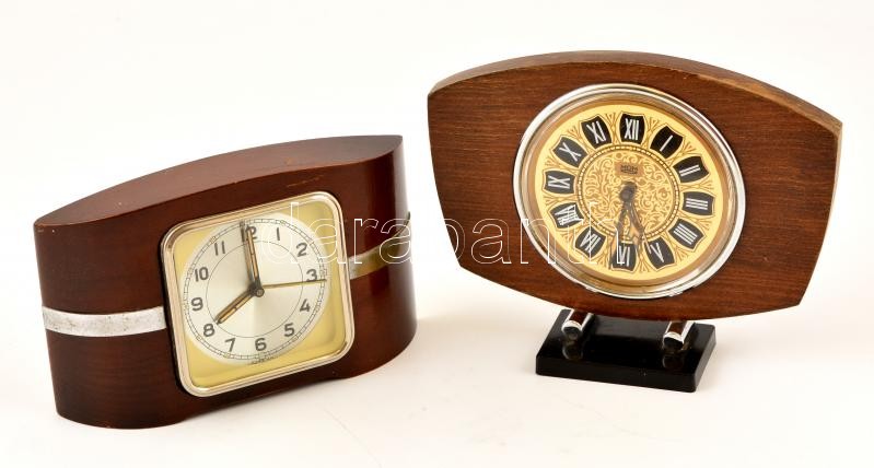 Leírás: MOM és Foreign asztali órák, felhúzók nélkül, fa óratestekkel, az egyik hátoldalán sérülésnyomokkal, kipróbálatlanok, 20x15 cm és 19x11 cm