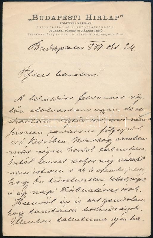 Rákosi Jenő (1842-1929) író, újságíró, szini igazgató saját kézzel írt... https://www.darabanth.com/hu/348-Gyorsarveres/348.0/Mutargy-papirregiseg-egyeb/Tortenelmi-dokumentumok-keziratok-erdekessegek~500018/Rakosi-Jeno-1842-1929-iro-ujsagiro-szini-igazgato-sajat-kezzel-irt-4-oldalas-levele-~II1979314