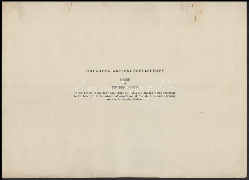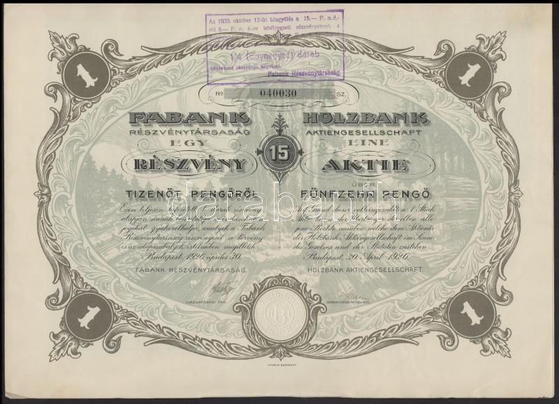 Leírás: Budapest 1926. "Fabank Részvénytársaság" részvénye 15P-ről, szelvényekkel, szárazpecséttel T:II