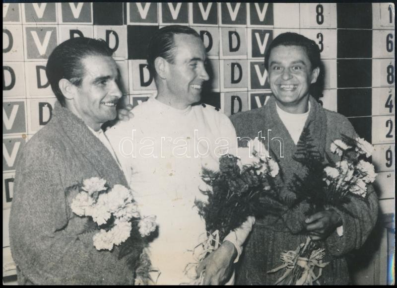 1952 Helsinki, XV. nyári olimpiai játékokon aranyérmet szerző kardvívó csapat három tagjának, Berczelly Tibor (1912-1990), Kovács Pál (1912-1995), Gerevich Aladár (1910-1991) fotója, 13x18 cm