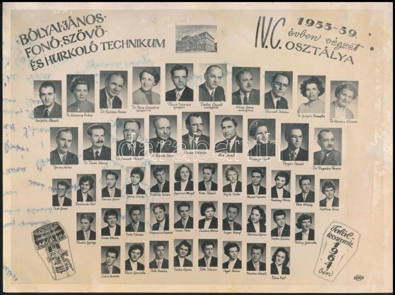 1959 Budapest, Bólyai János Fotó-, Szövő- és Hurkoló Technikum tanárai és végzett növendékei, kistabló nevesített portrékkal, tintafoltos, sérült, 18x24 cm