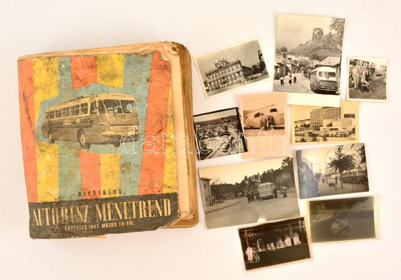 Autóbuszok tétele, különféle időpontokban és eltérő helyszíneken készült 8 db vintage fotó + 2 db vintage negatív (a pozitív képek és negatívok nincs összefüggés), 6x6 cm és 9x12 cm + hozzáadva egy 1967-es országos autóbusz menetrendet, ennek borítója tisztítást igényel, a 705 belső oldal információs értéke jól használható