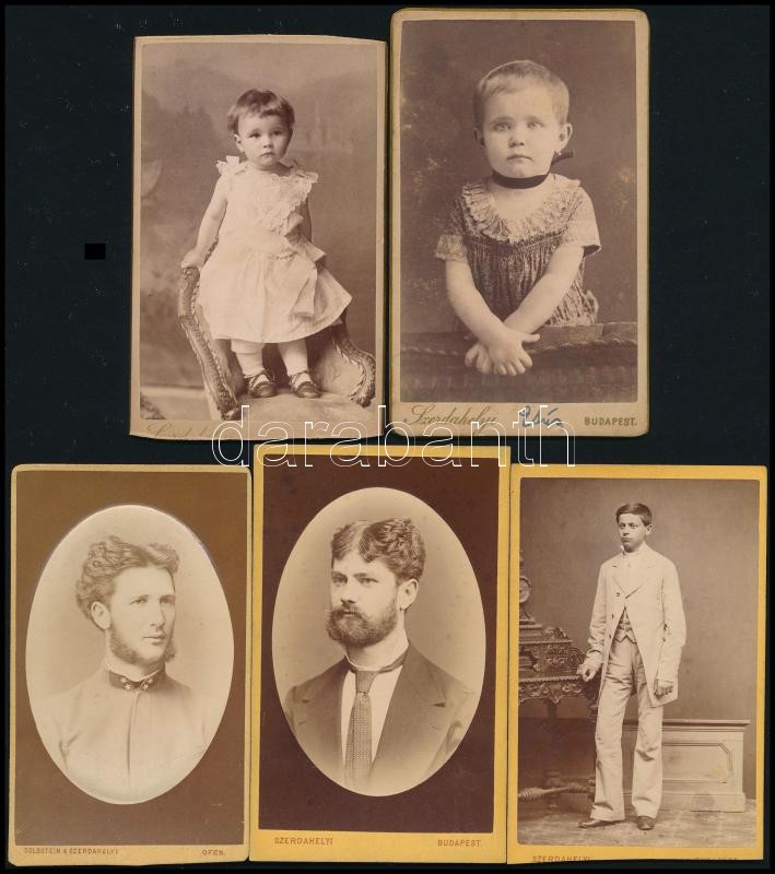 Leírás: cca 1900 Keményhátú műtermi fotók, 5 db, Szerdahelyi budapesti műterméből, 5 db, közte porcelánkép utánzatú dombornyomott fotó 2 db, 11×6,5 cm