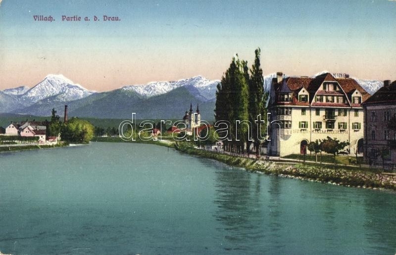 Leírás: Villach, Partie a. d. Drau, Kino. Verlag Kleinmayr 789/1. / Drava riverbank, cinema (Rb)