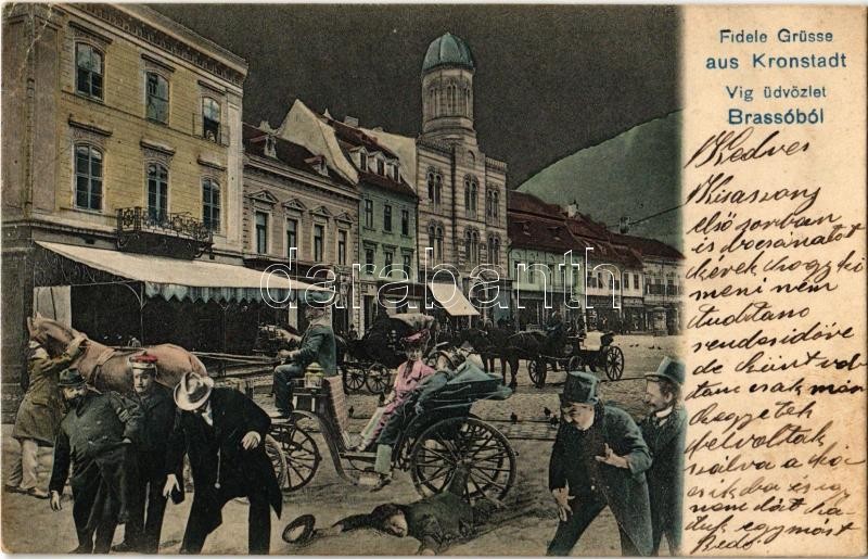 1906 Brassó, Kronstadt, Brasov; tér, Bruder Simay üzlete. Víg üdvözlet montázs részeg férfiakkal este / Fidele Grüsse / square, shops. Montage with drunk men at night (EK)
