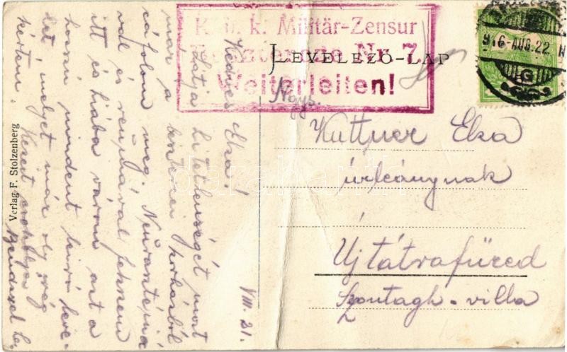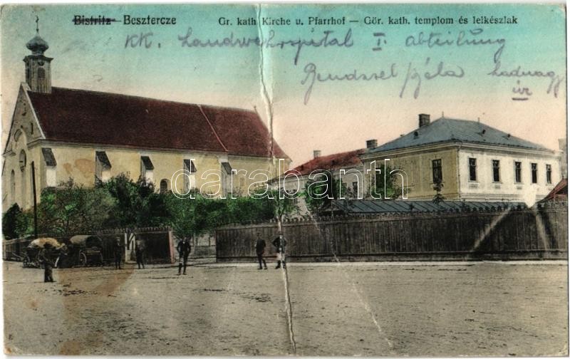 1916 Beszterce, Bistritz, Bistrita; Gr. kath Kirche u. Pfarrhof / Görögkatolikus templom és lelkészlak. Kiadja F. Stolzenberg / Greek Catholic church and parsonage (fa)