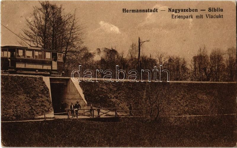Nagyszeben, Hermannstadt, Sibiu; Villamos viadukt az Erlen parkban. F. Binder kiadása / Viadkut der elektrischen Strassenbahn / tram viaduct in the park