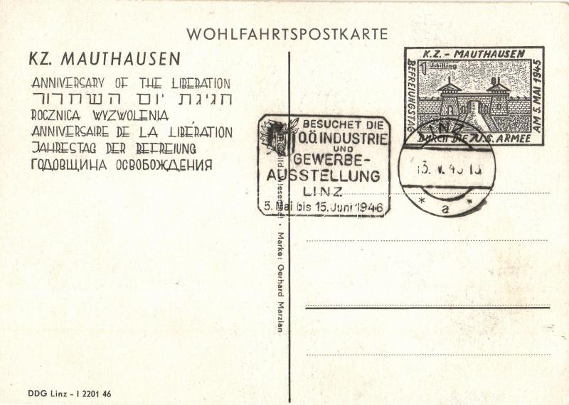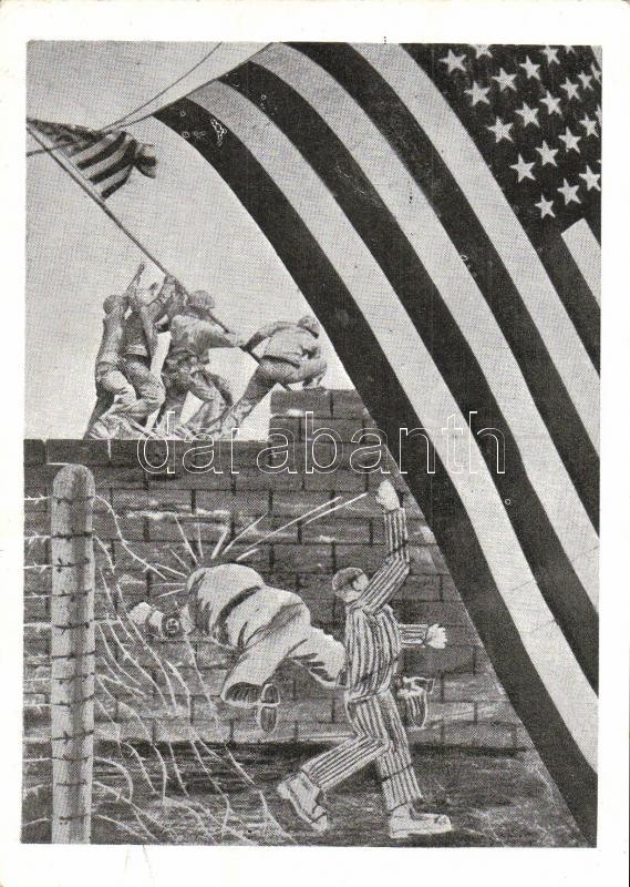 1945 KZ. Mauthausen. Anniversary of the Liberation / Mauthausen Concentration Camp memorial art postcard with American flag s: Simon Wiesenthal (Jewish Austrian Holocaust survivor)