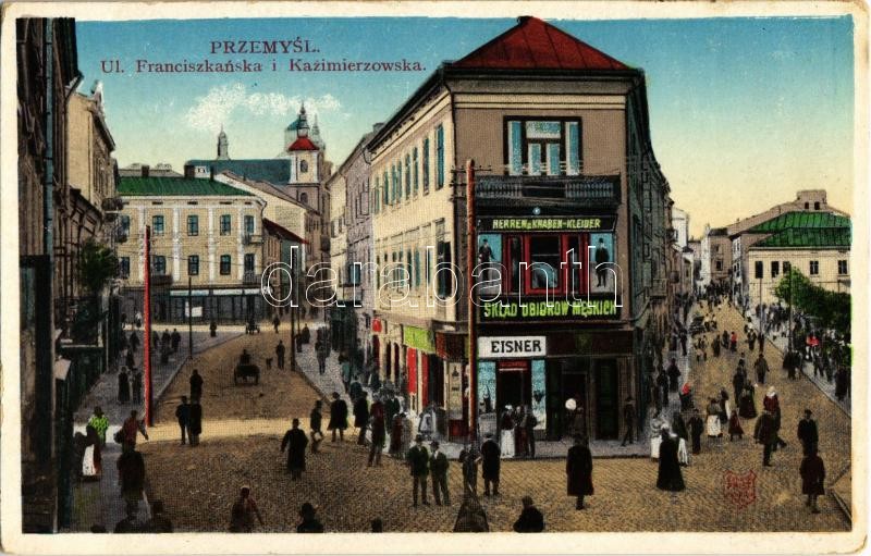 Leírás: Przemysl, Ul. Franciszkanska i Kazimierzowska, Sklad ubiorow meskich / streets, Eisner's men clothing shop