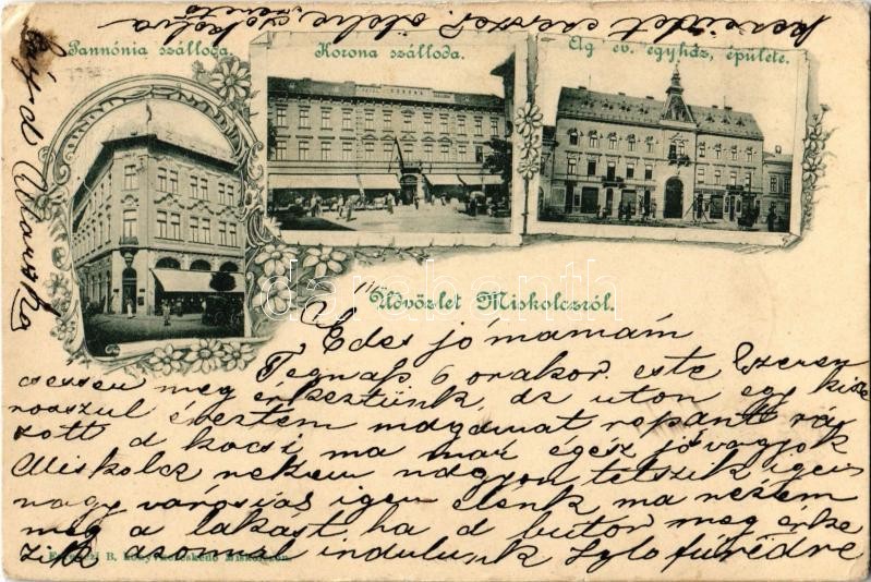 1899 Miskolc, Pannónia és Korona szálló, Ágostai evangélikus egyház ép... https://www.darabanth.com/hu/349-Gyorsarveres/349.0/Kepeslapok/Magyarorszag~2000005/1899-Miskolc-Pannonia-es-Korona-szallo-Agostai-evangelikus-egyhaz-epulete-Doman-Jozsef~II1985315
