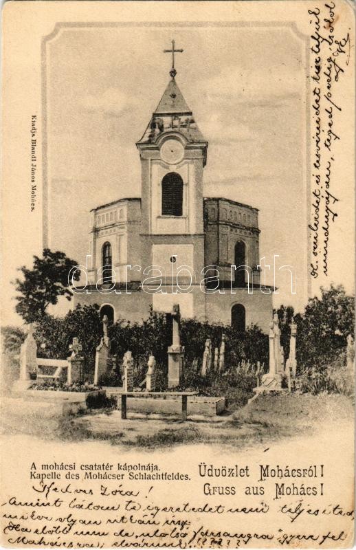 Leírás: 1903 Mohács, a mohácsi csatatér kápolnája, sírkert. Kiadja Blandl János (EK)