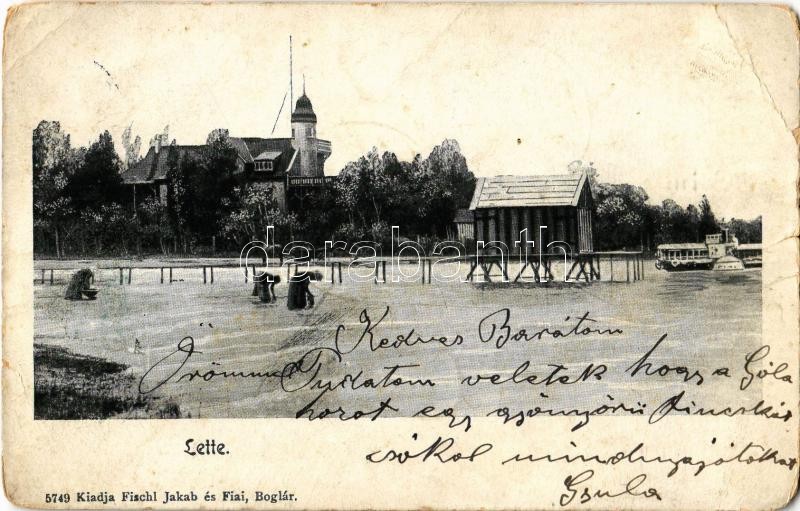 1904 Balatonlelle, Lette; Balaton part fürdőkabinnal, mosóasszonyokkal... https://www.darabanth.com/hu/349-Gyorsarveres/349.0/Kepeslapok/Magyarorszag~2000005/1904-Balatonlelle-Lette-Balaton-part-furdokabinnal-mosoasszonyokkal-es-gozhajoval-Fischl-J~II1985327