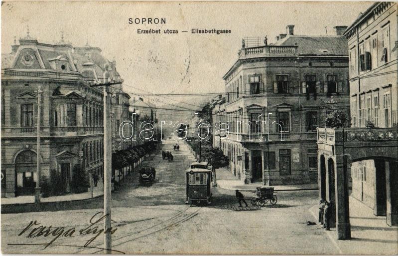 1908 Sopron, Erzsébet utca, Újhelyi ház, villamos. Kiadja Blum N. https://www.darabanth.com/hu/349-Gyorsarveres/349.0/Kepeslapok/Magyarorszag~2000005/1908-Sopron-Erzsebet-utca-Ujhelyi-haz-villamos-Kiadja-Blum-N~II1983945