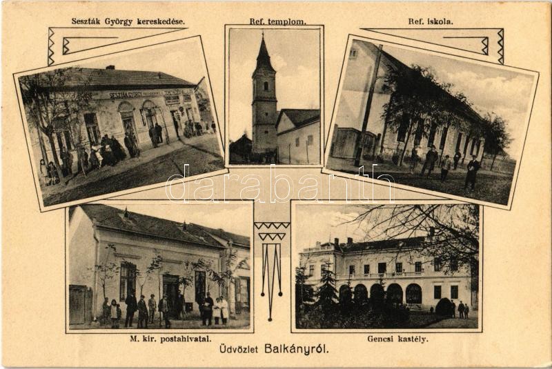 Leírás: 1937 Balkány, Református templom és iskola, Gencsi kastély, Postahivatal, Seszták György kereskedése és saját kiadása. Art Nouveau