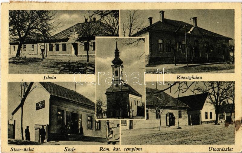 Leírás: 1943 Szár, Iskola, Községháza, Római katolikus templom, utca, Steer üzlet. Ster József kiadása (fl)