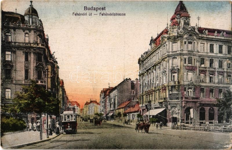 Budapest XI. Fehérvári út (ma Bartók Béla út eleje), Gellért Kávéház, Sörcsarnok és vendéglő, villamos, Gebauer József üzlete, Egyesült Budapesti Fővárosi Takarékpénztár, építkezés. Taussig 171. 1918/21.