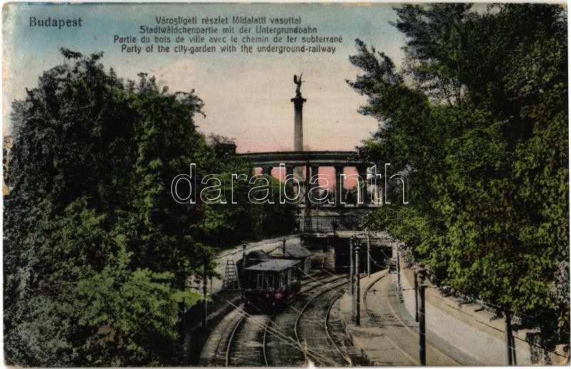 Leírás: Budapest XIV. Városliget, földalatti villamos vasút torkolata, Milleniumi emlékmű (Hősök tere) a háttérben. taussig 76. 1918/21. (szakadás / tear)