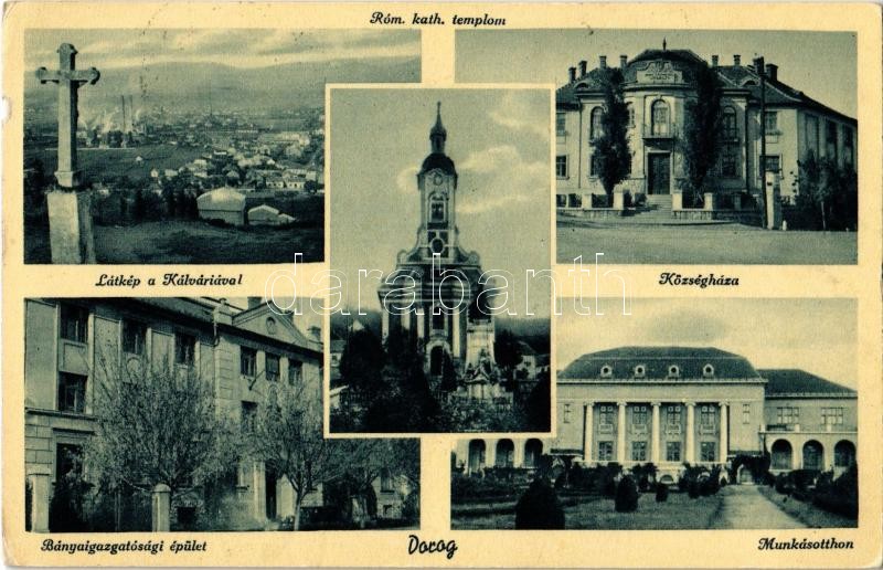 Leírás: Dorog, Római katolikus templom, községháza, munkásotthon, Bányaigazgatósági épület, Kálvária