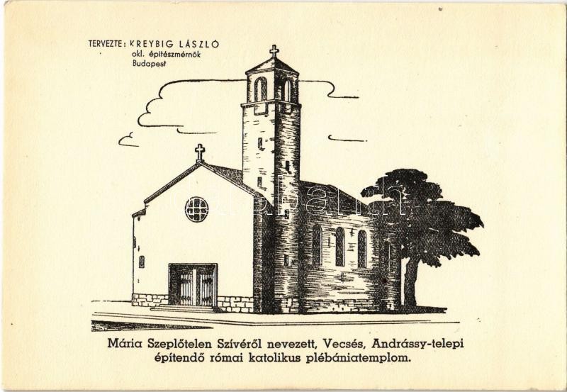 Vecsés, Mária Szeplőtelen Szívéről nevezett Andrássy telepi építendő római katolikus plébániatemplom. Tervezte: Kreybig László okleveles építészmérnök. Adakozz a templomépítés javára!
