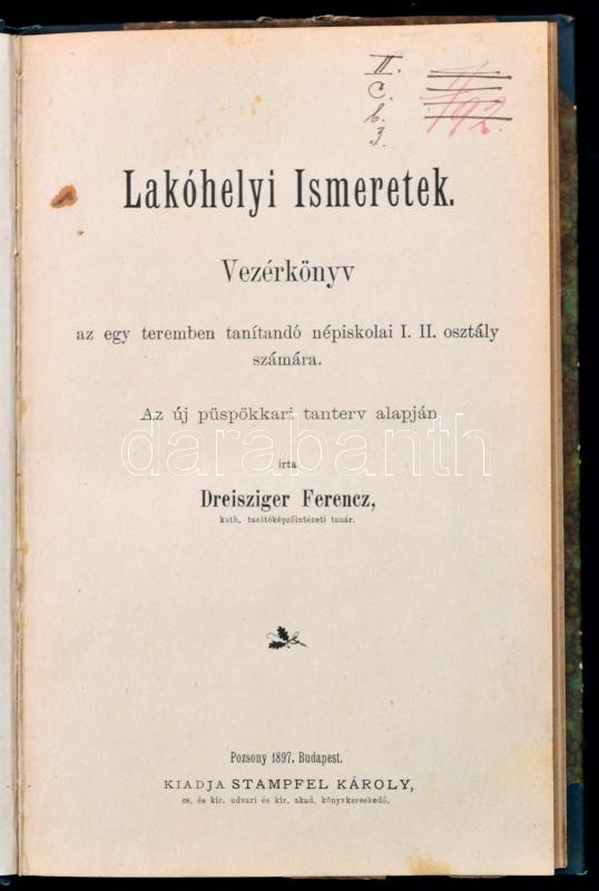 Dreisziger Ferenc: Lakóhelyi ismeretek. Vezérkönyv az egy teremben tanatandó népiskolai I. II. osztály számára. Pozsony, 1897. Stampfel. Félvászon kötésben.