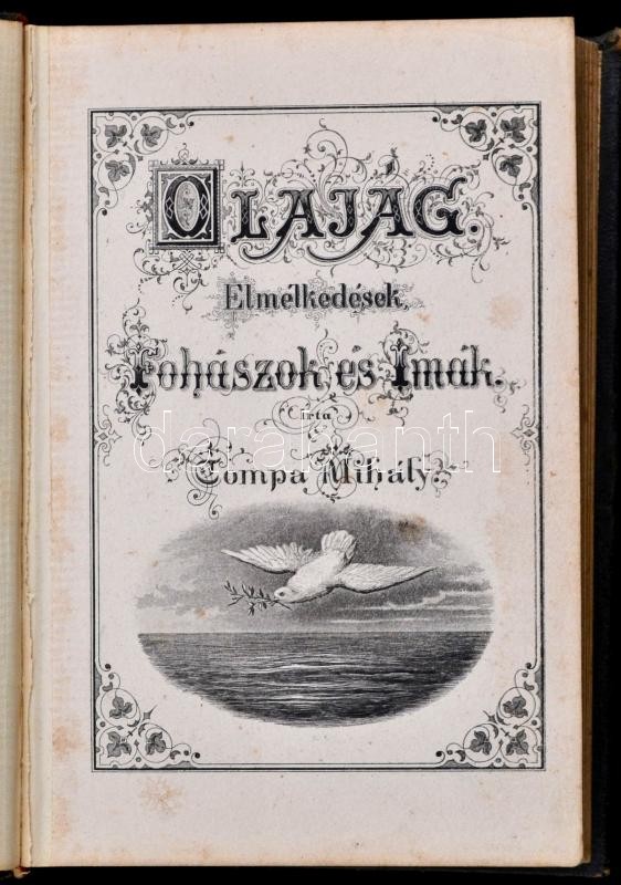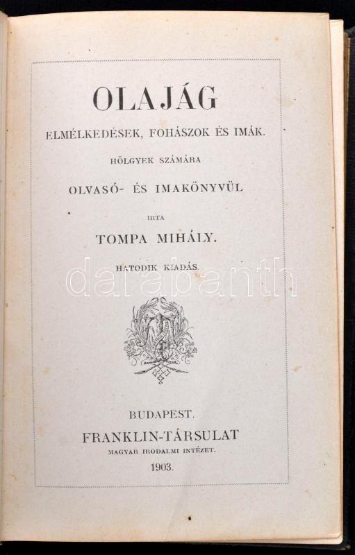 Tompa Mihály: Olajág. Elmélkedések, fohászok és imák. Hölgyek számára olvasó- és imakönyvül. Bp.,1903, Franklin, 1 t.+350 p. Hatodik kiadás. Kiadói aranyozott egészbőr-kötésben, a sarkain kis kopásnyomokkal, aranyozott lapélekkel, hiányos, sérült réz csattal, ajándékozási sorokkal.